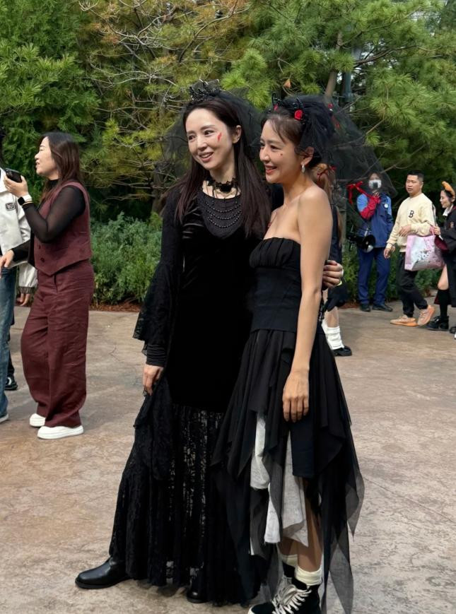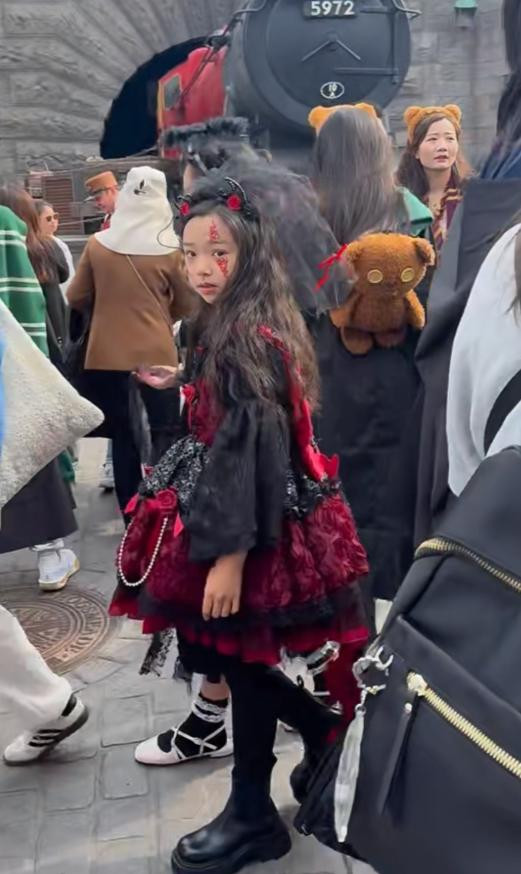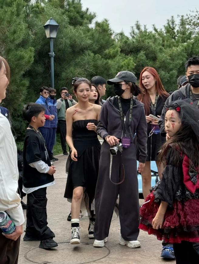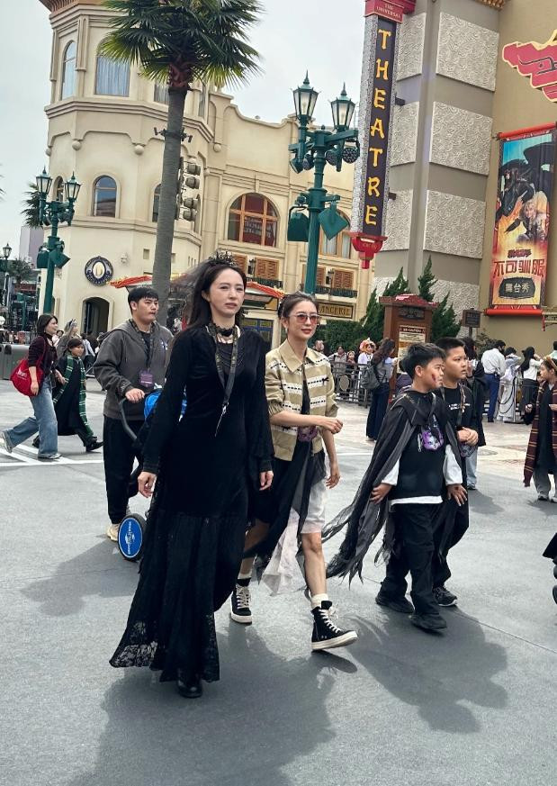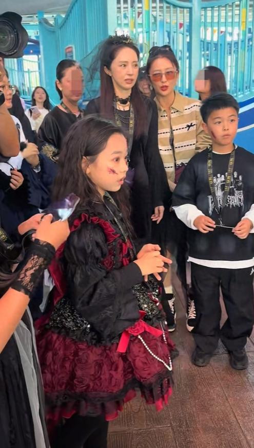 而且两人带娃游玩都是大大方方的,没有任何的遮挡,小酒窝打扮的像个小魔女还是很可爱,红配黑都挡不住她公主的美貌,反观董璇应该扮演的是女巫角色,而佟丽娅和朵朵则没有cos,穿着私服,玩的时候为了配合小酒窝,朵朵还穿上了一件黑色斗篷。
